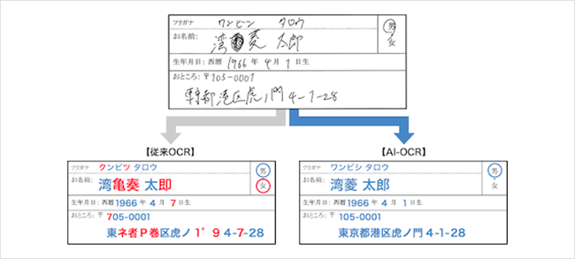 AI-OCRとは、OCRによる文字認識にAIの機械学習技術を活用した文字認識技術です。従来のOCRでは、日本語や手書き文字の認識が難しく、実用化が難しいという課題がありました。AI-OCRを使うことで、日本語や手書き文字も高い精度で読み取ることができ、実用的なレベルまで認識率が大きく向上しました。