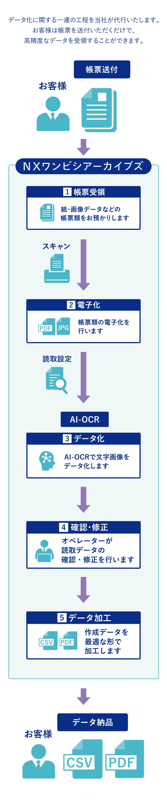 NXワンビシアーカイブズでは、お客様の業務内容や現状の課題、今後のご要望を丁寧にお伺いし、AI-OCRとBPOを組み合わせた最適な業務プロセスを設計・ご提案します。AIによるテキスト化やデータ抽出だけでなく、帳票ごとの特徴やAI-OCRの精度に合わせて必要な補正工程も含め、業務全体を一括して最適化するソリューションをご案内しています。納品は、CSV・EXCEL・PDFなどご要望に応じて柔軟に対応し、お客様ご利用システムへの連携も可能です。サービス導入前の検討から導入後の運用まで、お客様が業務改善や効率化を実現できるよう、総合的なサポートをご提供します。