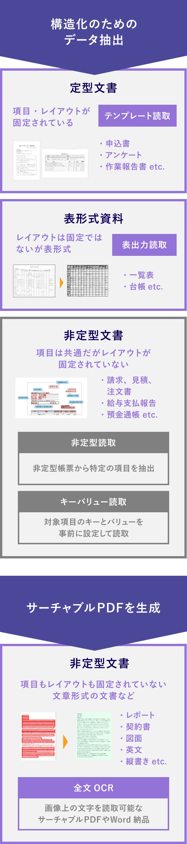 「AI-OCR」は製品によって得意分野が異なるため、データ化したい帳票(紙書類、PDFファイルなど)と相性の良い製品での読み取りが必要です。その最適な「AI-OCR」の選定を当社が選定。また定型帳票や非定型帳票、表形式の書類といった帳票パターンに対応可能です。
