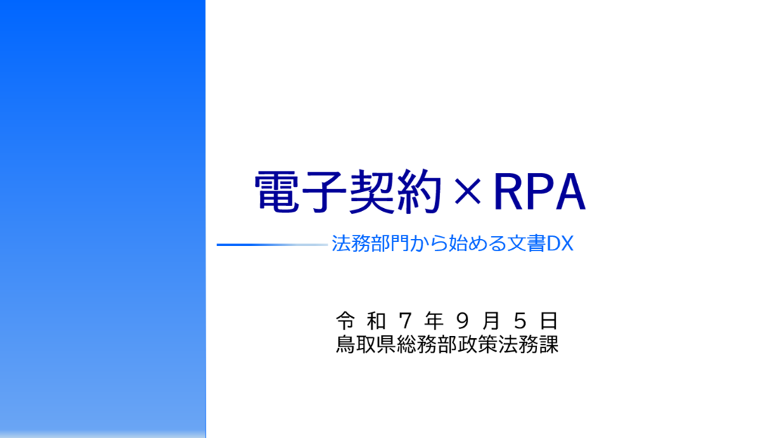 続いて、運用開始から3か月で300件、1年で3,000件を超える契約の電子化を実現し、電子契約の利用拡大に成功されている鳥取県庁様より、明治様にご登壇いただきました。新型コロナ対策の中、電子契約の導入が急務とされていた状況で、どのように推進し、全庁展開の開始まで進めることができたのか、そのノウハウと課題への取り組みについてご講演いただきました。RPAも活用した業務の自動化・効率化の事例も具体的にご紹介いただき、ご参加者様からは「RPAに絡めた利用事例など、さまざまな情報を入手できた」「導入の大変さや乗り越え方など、詳細でリアルな内容を聞くことができてよかった」などの多くのご感想をいただきました。![]()