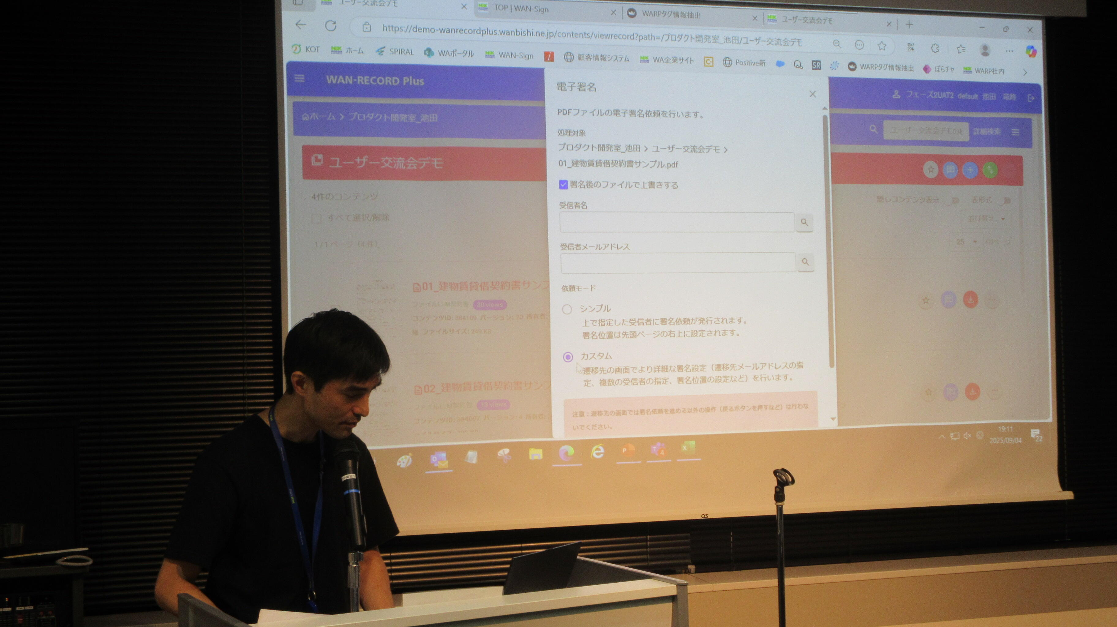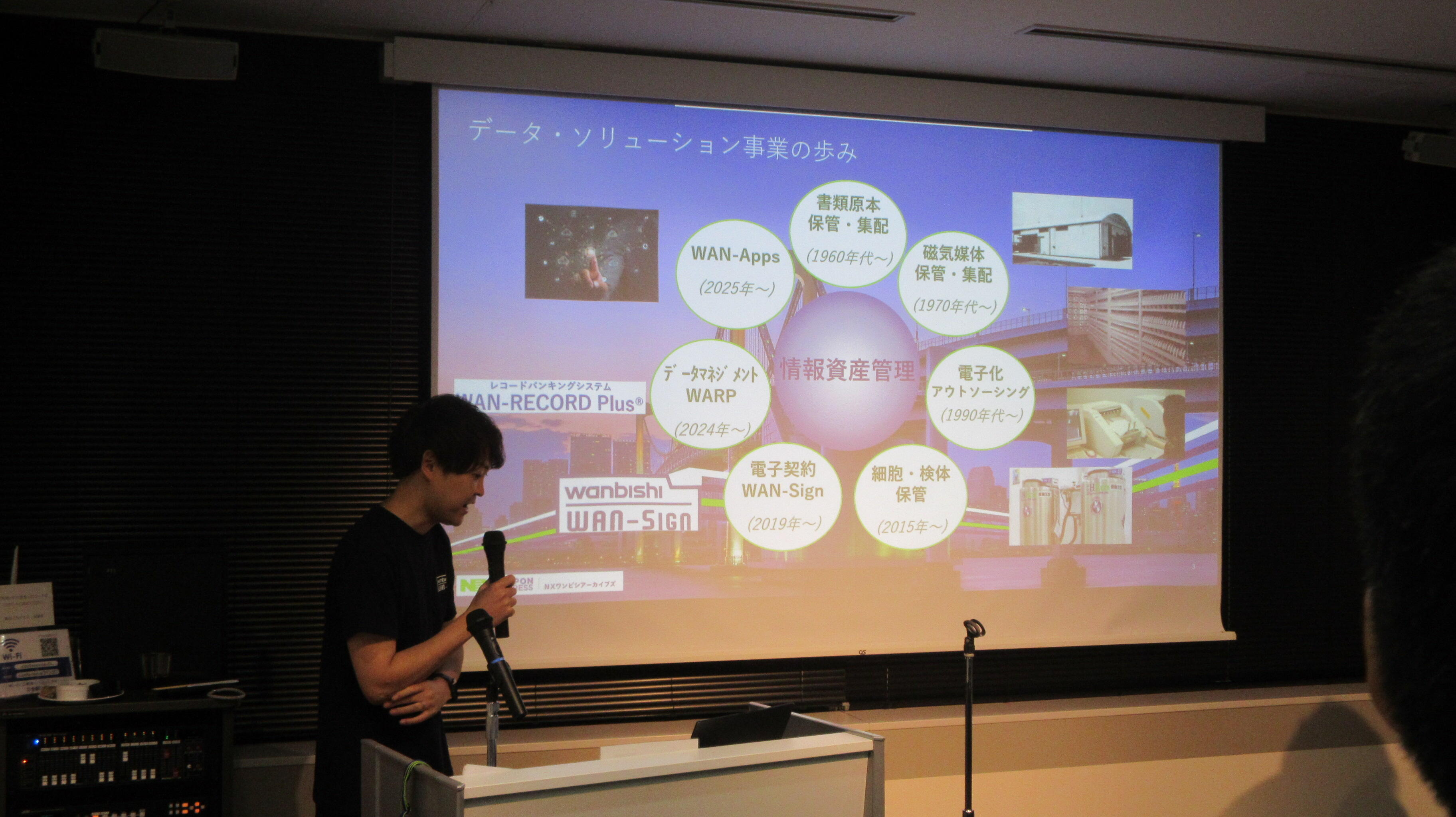懇親会では、WAN-Sign事業推進室長の大川より、WAN-Signのこれまでの歩みや最新のバージョンアップについてご案内し、「AI契約書管理機能」の強化についてもご紹介いたしました。また、プロダクト開発室長の池田からは、NXワンビシアーカイブズのレコードバンキングシステム「WAN-RECORD Plus®(WARP)」の生成AI機能の紹介やデモンストレーションをご案内いたしました。